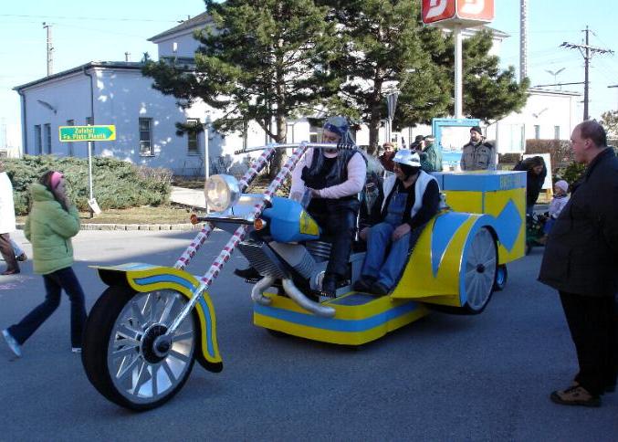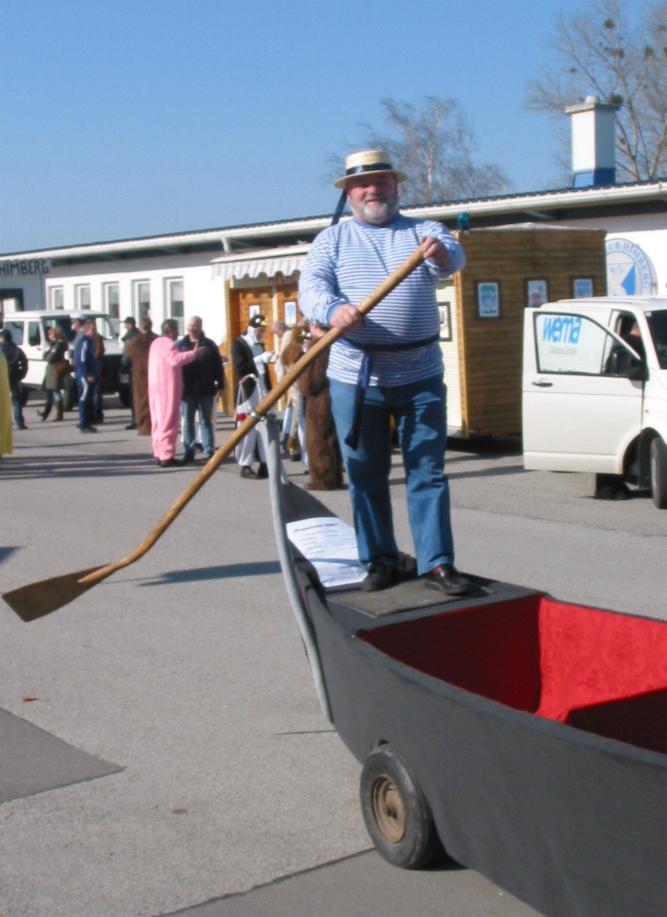 Auch heuer haben es unsere fleißigen Bastler (Hr. Meller, Hr. Sagl und Hr. Savel) geschafft, ein Fahrzeug für den Umzug herzustellen. Diesmal war unser Thema Venedig und es musste natürlich eine originalgetreue Gondel sein. Lediglich der italienische Gondoliere konnte wegen eines Streiks nicht kommen, daher sprang für ihn Hr. Sagl ein. Weil in den letzten Jahren unsere Eisenbahn immer öfters ausfällt, wird möglicherweise in weiterer Folge ein Linienschiffsverkehr am Kalten Gang nach Schwechat aufgenommen. Diesmal wurde auch unsere Route geändert und zwar ging es zuerst zum Laurentiusheim, dann zum Bahnhof und erst danach über die Bahnstraße zum Hauptplatz, wo wir von einer fast unübersehbaren Menschenmenge begrüßt wurden. Bei wunderschönem Winterwetter konnten wir heuer einen wesentlich besseren Besuch als in den vergangenen Jahren verbuchen. Heuer gab es erstmals die Getränke nicht mehr gegen freie Spende sondern nur gegen einen fairen Preis, da der Umzug sonst unfinanzierbar geworden wäre, was man an den in den letzten Jahren immer weniger werdenden Teilnehmern bemerken konnte. Bei der letzten Sitzung wurden die Preise festgelegt und zwar für alkoholische Getränke € 1,50 und für alkoholfreie Getränke € 1,00. Würstchen gab es um € 2,00 und Aufstrichbrote um € 1,00.